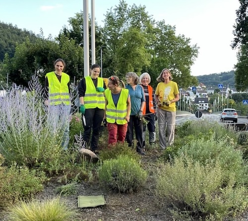 Autofahrer zeigen ihre Wertschätzung (Foto: privat)(bro) (chk) Vor einiger Zeit fand ein Arbeitseinsatz des NABU Eberbach-Schönbrunn am einzigen Verkehrskreisel der Stauferstadt statt. Der im Frühling 2023 angelegte Kreisel wurde im Rahmen des Pflegeeinsatzes von Beikraut befreit, zurückgeschnitten und auf Vordermann gebracht – zur Freude vieler Autofahrer, die während der Arbeiten hupend und winkend ihre Anerkennung zeigten.