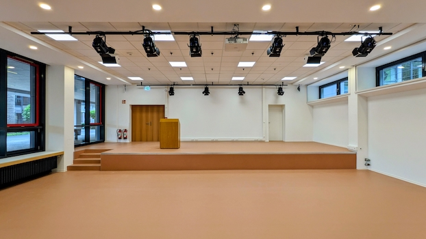 Die Aula im Hohenstaufen-Gymnasium konnte bereits vor Ferienbeginn für die Einschulungsveranstaltung der neuen fünften Klassen genutzt werden. Über die Ferien erfolgten nun die Fertigstellung des Vor- und Nebenraums sowie die Installation der Medientechnik, sodass der Schule nun ein renovierter und topmoderner Veranstaltungsraum zur Verfügung steht.
