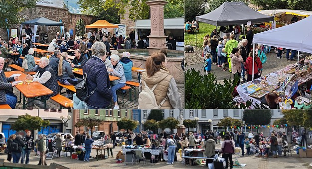Das Fest fand nun schon zum 14. Mal statt. Eröffnet wurde es um 11 Uhr mit den Klängen des Eberbacher Fanfarenzugs. Es folgte ein bunter Tag mit vielfältigem Bewirtungsangebot, Verkaufsständen (unter anderem vom Imkerverein samt dem Schulhonigprojekt und von Frauen aus der Ukraine), Live-Musik und einem Kindersachen-Flohmarkt auf dem Leopoldsplatz (Bild unten).