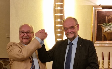 1.000 Euro für die Hospizarbeit Alain De Vit, Präsident RC EvianThonon mit Herold Pfeiffer, Präsident RC Eberbach. (Foto: privat)(bro) (wk) Bereits im Jahr 1968 wurde die Partnerschaft zwischen dem französischen Rotary Club Evian/Thonon und dem Rotary Club Eberbach begründet. Seit diesem Zeitpunkt treffen sich die beiden Clubs einmal im Jahr. Nachdem die Eberbacher Rotarier im letzten Jahr zu Gast in Evian waren, durften sie am Wochenende, 3. bis 5. Oktober, die Freundinnen und Freunde des französischen Partnerclubs in Eberbach begrüßen.