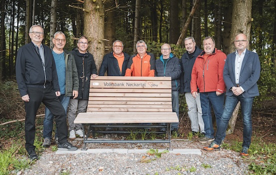 Eine Spende der Volksbank Neckartal-Stiftung (Foto: Gemeinde Schönbrunn)(bro) (jf) Ein neuer Ruhepunkt bereichert ab sofort den beliebten, zehn Kilometer langen Rundweg um Schönbrunn-Haag: Dieser Tage wurde dort ein sogenanntes Waldsofa offiziell übergeben. Aufgestellt wurde die nachhaltige Relaxliege aus Holz von Ehrenamtlichen aus dem Ort, die mit großem Einsatz Hand anlegten, um den Aufbau zu realisieren.
