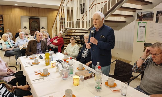 Nach seiner Amtszeit hat der heutige Wahl-Schollbrunner sein Buch "Jetzt wĂ€rÂŽs recht dann, Herr Bürgermeister" mit Anekdoten rund ums Rathaus geschrieben. Mit Geschichten aus diesem Buch erfreute Schlesinger Vertreterinnen und Vertreter des Heimbeirats, des Vereins âStiftung Altersheim Eberbach e.V." sowie Bewohnerinnen und Bewohner des Pflegeheims, die zahlreich zu diesem Kaffeenachmittag erschienen waren.