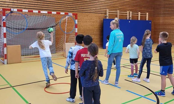 Sabine Kaschper, Manuel Kaschper und Alexander Schwab von der Handballgesellschaft Eberbach (HGE) bauten sechs Stationen auf und begleiteten die Schülerinnen und Schüler fachkundig. Die drei zweiten Klassen der Grundschule und die Klasse 2/3/4 des “Sonderpädagogischen Bildungs- und Beratungszentrums mit Förderschwerpunkt Lernen" (SBBZ) durften sich am Freitagvormittag in Zielschießen, Wurftechnik, Kraft- und Koordinationsübungen sowie einem Handballspiel auf dem Kleinfeld versuchen. Unterstützt wurden die Handballer noch von Eltern und den Lehrerinnen. Vom Handballverband gab es am Ende noch Aufkleber, Tattoos, ein kleines Regelheftchen und einen Adventskalender für die Klassen.