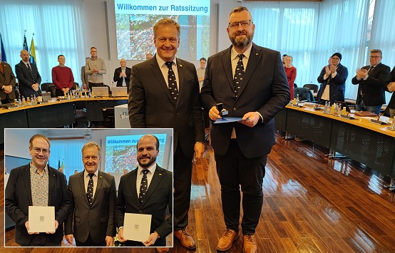 Ehrenring für Stadtrat Jens Müller Großes Bild: Jens Müller (r.) mit Bürgermeister Peter Reichert. Kleines Bild: Die Ehrung von Benjamin Müller (l.) und Jan-Peter Röderer (r.). (Fotos: Claudia Richter)(cr) SPD-Stadtrat Jens Müller wurde in der Sitzung des Eberbacher Gemeinderats am Donnerstag, 18. Dezember, mit dem Ehrenring der Stadt Eberbach ausgezeichnet.