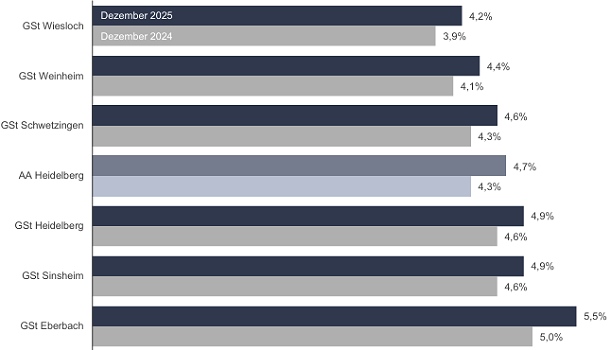 Eberbach führt die Arbeitslosenstatistik im Bereich Heidelberg weiterhin an (Grafik: Bundesagentur für Arbeit)(hr) (aa) Laut der Bundesagentur für Arbeit lag im Bezirk der Geschäftsstelle Eberbach die Arbeitslosigkeit im Dezember 2025 weiterhin um einen halben Prozentpunkt höher als im Vorjahresmonat.