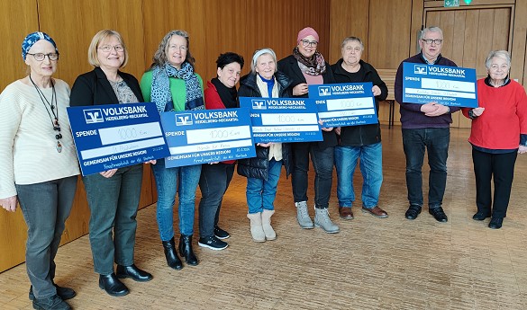 In der Vorweihnachtszeit lud das Team der Kreativwerkstatt zum Weihnachtsverkauf ins katholische Pfarrheim in der Feuergrabengasse ein. Zum Kauf wurden unter anderem Handarbeiten, Türkränze und Deko-Artikel angeboten. Bei der Veranstaltung wurden über 5.000 Euro erwirtschaftet, die Organisatorin Elisabeth Draxler und ihre Mitstreiterin Christiane Hofmann vom Kreativteam am Freitag, 20. Februar, offiziell als symbolische Spendenschecks übergaben. Über je 1.000 Euro freuen durften sich Susanne Meyer (Sozialdienst katholischer Frauen) für das St. Paulusheim, Ulrike Riedl für den Verein “Hände für Kenia e.V.â€, Büsra Isik und Curd Walschburger für den AWO-Laden Eberbach, Ida Nietsch und Sandra Wäsch für den Verein “Helfende Engel Neckar-Odenwald e.V.†und Diakon Joachim Szendzielorz als Vertreter der “Karitativen Dienste St. Elisabethâ€.