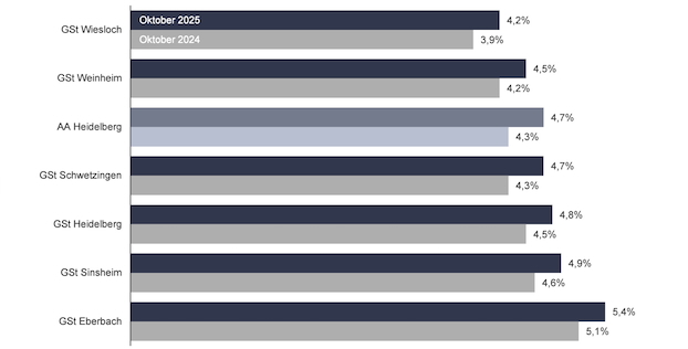 Eberbach verzeichnet Rückgang bei Arbeitslosigkeit im Oktober Die Arbeitslosigkeit im Oktober nach Geschäftsstellen. (Quelle: Agentur für Arbeit)(bro) (aa) Die Arbeitslosigkeit im Bezirk Eberbach hat sich von September auf Oktober um neun auf 526 Personen verringert. Die Arbeitslosenquote auf betrug im Oktober 5,4 Prozent, vor einem Jahr belief sie sich auf 5,1 Prozent.
