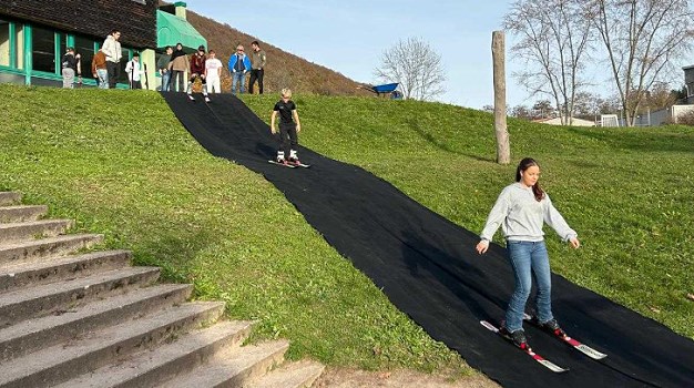 Dabei wurde eigens eine 30 Meter lange schwarze Vliespiste aus Stoffbahnen angeschafft. Ausgerollt auf einem Wiesenhang hinter der Realschule üben hier die Skineulinge das Abfahren und das parallele Aufsteigen. In kompletter Skiausrüstung, ohne Stöcke, geht es den Hang hinab. Es gilt die nötigen koordinativen Fähigkeiten zu schulen. So tun sich die Anfänger später im Skigebiet wesentlich leichter und erzielen schneller persönliche Erfolge. Außer den Trockenübungen auf der “Schwarzen Piste“ findet zur Vorbereitung noch wöchentlich einmal Skigymnastik in der Turnhalle statt.