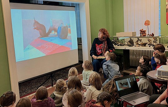 Mit einem begeisterten “Ja“ antworteten die kleinen Besucher, die sich auf Kissen vor der Leinwand mit den unterhaltsamen Zeichnungen zu den Episoden von Hazel, dem Stadthörnchen, versammelt hatten. Die Autorin und Illustratorin des Kinderbuchs, Dorothea Weber, war auf Einladung des Freundeskreises Langbein´sche Sammlung und Heimatmuseum Hirschhorn e.V. aus Wiesbaden angereist, um im Museum in Hirschhorn den rund 25 Kindern im Alter ab vier Jahren das Leben und die Abenteuer des Eichhörnchens Hazel näher zu bringen.