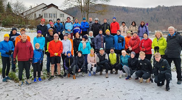 Knapp 50 Laufbegeisterte gingen wieder am Turnerheim des TVE an den Start. Bei winterlichen Temperaturen startete gegen 13 Uhr die Lauf- und Walkinggruppe unter der Leitung von Fritz Kaufmann fröhlich und voller Bewegungsdrang am Jahnplatz in Richtung Schlüsselacker zum Kanalweg, am Itterkanal entlang und wieder zurück. Einen Zwischenstopp versprach Kaufmann unterwegs an der "Wendeplatte". Dort konnten sich die Teilnehmenden mit einem Glas Sekt stärken.