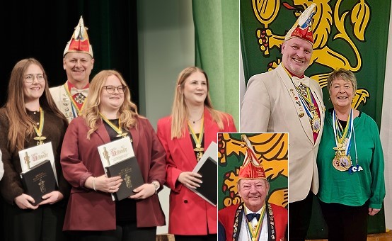Die bislang höchste Auszeichnung der Vereinigung, der Orden “Goldener Löwe mit Brillantenâ€, wurde am gestrigen Samstag, 3. Januar, an Regina Becker und Dirk Müller von der Karnevalgesellschaft Kuckuck (KGK) verliehen (rechtes Bild). Gewürdigt wird damit eine mehr als 44-jährige aktive ehrenamtliche Tätigkeit im fastnachtlichen Brauchtum. Ebenfalls den Goldenen Löwen mit Brillanten erhielt Dieter Verfürth vom Club Eulenspiegel Rockenau (kleines Bild).