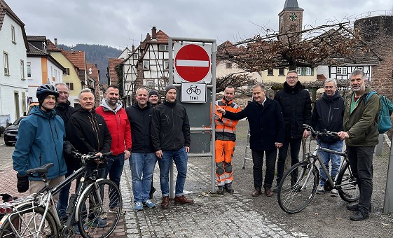 Seit Mittwoch, 28. Januar, können die Einbahnstraßen Bussemerstraße und Adolf-Knecht-Straße vom Fahrradverkehr auch in Gegenrichtung befahren werden. Zur Montage des ersten Schilds kamen auch Mitglieder der Arbeitsgruppe Mobilität, die sich seit einigen Jahren für eine Verbesserung des Verkehrs in Eberbach einsetzt.
