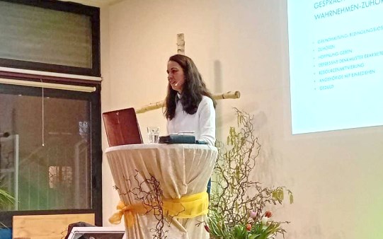Pastor Marc Förster begrüĂźte die rund 50 Gäste. Das neue Veranstaltungsformat soll dazu einladen, zur Ruhe zu kommen, den Tag mit netten Menschen ausklingen und sich verwöhnen zu lassen. Ein aufgebautes Vorspeisen-Buffet war sichtbares Zeichen dafür und wurde vom Küchenteam noch weiter kulinarisch umgesetzt. Nach dem Hauptgang und Dessert war die erste Stunde bereits wie im Flug vergangen. Für den zweiten Teil des Abends war Dr. Ana-Maria Kreuter aus Schriesheim gekommen. Nach einer kurzen Vorstellung begann sie ihren Vortrag zum Thema “Depression – wenn das Leben nur noch dunkel scheint“. Als promovierte Humanmedizinerin klärte sie über allgemeine Fakten und Statistiken zur Depression auf. Sie erklärte, welche Symptome sich bereits im Frühstadium zeigen und welche äuĂźeren Umstände eine solche Krankheit begünstigen. Neben den eher schwierigen Fakten konnte sie dem Publikum auch Hoffnung vermitteln: “Depression ist heilbar.“ Kreuter erklärte, wie Betroffenen durch Gespräche, Therapien oder auch durch Medikamente geholfen werden könne. Auch den Halt im christlichen Glauben verschwieg sie nicht, sondern erzählte von Menschen, die sich genau dadurch in ihrer dunkelsten Zeit gehalten wussten.