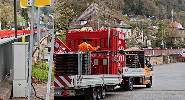 Weiterer Bauabschnitt startet heute Die Einrichtung der Baustelle läuft. (Fotos: Hubert Richter)(hr) Die Sanierungsarbeiten an der Stützmauer der Uferstraße (B 37) in Eberbach gehen heute in den 5. Bauabschnitt.