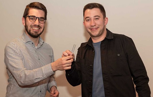 Moritz Link hat die Chorleitung übernommen Fabio Freund (l.) übergibt die symbolische Stimmgabel an Moritz Link. (Foto: privat)(hr) (ah) Nach fünfeinhalb Jahren verlässt Chorleiter Fabio Freund den MGV Liederkranz. Sein Nachfolger ist Moritz Link.