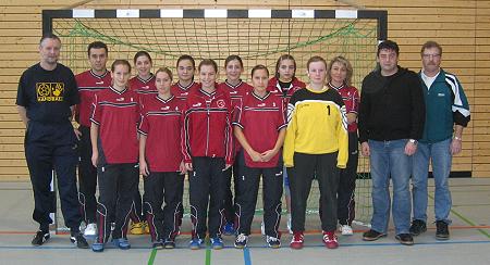 (Foto:privat)(jc) (js) Mit neuen Aufwärm-T-Shirts ausgestattet wurde die weibliche A-Jugend der JSG Waldbrunn/Eberbach von der LBS, vertreten durch Steffen Eich. Über das willkommene Weihnachtsgeschenk freuten sich die Mannschaft mit ihren Trainern Elisabeth Diemer und Christian Menges, HGE-Jugendleiter Joachim Kaschper und SGW-Abteilungsleiter Handball Uwe Weis. Die A-Jugend dankte mit einem souveränen 23:13 Sieg gegen den SSV Vogelstang und beendete das Jahr 2004 ungeschlagen gemeinsam mit der SpVgg Baiertal an der Tabellenspitze der Handballbezirksliga Heidelberg/Mannheim.
