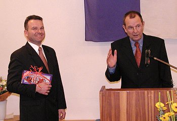 Bruno Schmitt, dienstältester Stadtrat und nach Gemeindeordnung vom Gremium einstimmig für diese Aufgabe gewählt, nahm die Verpflichtung Martins vor. Angesichts leerer Kassen ist wohl eine Feuerwehrmann an der Spitze von Nöten, so zumindest ist das Geschenk des Gemeinderats an Bernhard Martin zu verstehen. Ein Spielzeug-Feuerwehrauto überreichte Bruno Schmitt nach der Verpflichtung. Auch die Überbringer der Grußworte, Elke Brunnemer, Albin Herrmann als Vertreter des verhinderten Landrats und Roland Schilling kamen am Thema Finanzen nicht lange vorbei und verbreiteten auch keineswegs Hoffnung auf Besserung sondern prophezeiten eine weitere Verschärfung der Lage. Da ein solcher Tag aber keine negativen Schlüsse zulässt ließ man keinen Zweifel daran, dass Martin diese "Herkules-Aufgabe" trotzdem meistern werde.