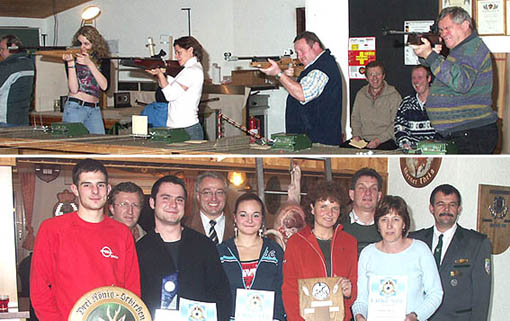 (tb) Sein traditionelles Dreikönigsschiessen veranstaltete der Sportschützenverein Dielbach in seinem Schützenhaus. Teilgenommen hatten hierbei viele Mannschaften aus ganz Waldbrunn. Geschossen wurde auf Glücksscheiben, so dass auch weniger geübte Schützen zum Zuge kommen konnten. Wiederum hatte man viele Sachpreise, als ersten Preis gab es ein halbes Schwein, ausgelobt. Dementsprechend groß war auch der sportliche Ehrgeiz, mit dem die jeweils vier Schützen einer Mannschaft an den Schießstand gingen. Spannend war es dann bei der Siegerehrung, da die Mannschaft des Kegelclubs "Schieb Du Sie", der in den letzten vier Jahren gewinnen konnte, sich nicht ganz vorne platzieren konnte. Bei der Siegerehrung dankte Oberschützenmeister Holger Braun allen teilnehmenden Mannschaften und Vereine, die ihre Mitglieder für dieses Dreikönigschiessen mobilisiert hätten. Alles in allem wäre es eine sportlich saubere Veranstaltung gewesen. Die Grüße der Gemeinde überbrachte dann Bürgermeister Klaus Schölch, der zusammen mit Oberschützenmeister Holger Braun und Ortsvorsteher Herbert Bachert die Siegerehrung vornahm. Andrea Rendler von der Mannschaft Bierbrezel mit 147 Punkten. Ihr Mannschaftskollege Stefan Schölch wurde mit 144 Punkten Zweiter vor Eduard Haas vom SV Dielbach, der 142 Punkte erreichte. In der Mannschaftswertung siegte bei den Damen wie im Vorjahr das "Kleeblatt" (499 Punkte) vor dem Reitclub Hoher Odenwald Strümpfelbrunn (486 Punkte) und dem Strickclub 1972, der 471 Punkte erreichte. Den Wanderpokal konnten dann die Schützen vom "Bierbrezel" mit nach Hause nehmen. Ebenso wie das ausgelobte halbe Schwein für die Mannschaft mit dem besten Ergebnis. Sie erreichten 564 Punkte. Mit 549 Punkten belegte die Mannschaft vom SV Dielbach den zweiten Platz. Dritter wurde mit 531 das Team vom "Bauwagen Schollbrunn". Die Ehrenscheibe des Jahres 2005 ging an Stefan Schölch von der Mannschaft "Bierbrezel.