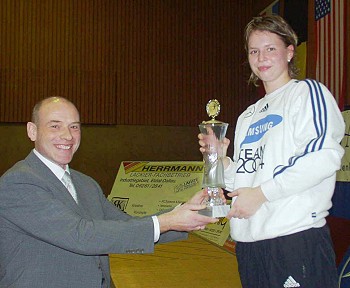 Verena Latty vom Fecht-Club Mosbach überrascht mit Platz 3 Stefan Ruhm von der DGF Stoess AG bei der Pokalübergabe an die Turniersiegerin. (Foto:privat)(jc) (jp) Die internationale Fechtelite im Damenflorett traf sich am Wochenende bereits zum 13. Mal in Mosbach. 82 Fechterinnen aus fünf Nationen traten beim 6. CH-Alpha® Cup in der Auguste-Pattberg-Halle in Mosbach-Neckarelz an, um wichtige Ranglistenpunkte zu sammeln und sich für die Weltmeisterschaft 2005 in Leipzig zu qualifizieren. Fast ausnahmslos war die Spitze des deutschen Damenflorett zugegen, denn darüber hinaus ist das bei den Sportlerinnen sehr beliebte Turnier des Fecht-Club Mosbach mit entscheidend für die Besetzung der deutschen Weltcupmannschaft in der neuen Saison. Ihren Titel verteidigte auch bei der sechsten Auflage des CH-Alpha® Cup die Tauberbischofsheimerin Katja Wächter, die im Finale Edina Knapek aus Ungarn klar mit 15:10 besiegte. Erfreulich aus Mosbacher Sicht bahnte sich Verena Latty den Weg unter die letzten Vier.