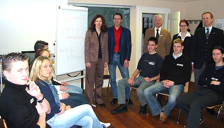 Volksbank Neckartal fördert VHS mit 10.000 Euro Stippvisite beim Kurs "Rhetorik und Kommunikation": (v.r.stehend)Ekkehard Saueressig, Vorstand der Volksbank, Sabine Heckel, Marketingassistentin, Hugo Sablowski, Marketingleiter, VHS-Leiter Erol Weiß und Dozentin Cornelia Albert mit einigen Kursteilnehmern. (Foto:Zechel)(jc) Vor einem knappen Jahr begann eine inzwischen schon sehr fruchtbare Kooperation zwischen der vhs Eberbach-Neckargemünd und der Volksbank Neckartal eG unter dem Motto: "Gemeinsam für mehr Bildung". Auch in diesem Jahr wird die Volksbank Neckartal Projekte der Erwachsenenbildung mit stattlichen 10.000 Euro fördern.