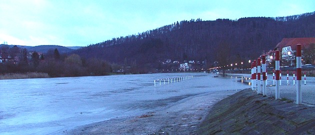 Neckar geht an Land (Foto:Richter)(hr) Eine zaghafte Landpartie unternimmt der Neckar mit seinem ersten Hochwasser im Jahr 2005. Nachdem bereits vorgestern Abend der Neckarlauer-Parkplatz vorsorglich gesperrt wurde, trat der Fluss gestern im Lauf des Tages tatsächlich über das stadtseitige Ufer. Am Abend wurde am Eberbacher Pegel ein Stand von über 4 Metern abgelesen.