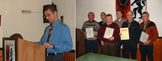 Mitglieder müssen treu bleiben (Li.)Vorsitzender Ralf Heckmann bei der Präsentation seines Jahresberichts sowie die anwesenden Mitglieder, welche für langjährige Vereinszugehörigkeit ausgezeichnet wurden. (V.l.): Karl Wilhelm, Vorsitzender Heckmann, Siegfried Fink, Rolf Heckmann, Dieter Heiß und Jürgen Heckmann (Foto:privat).