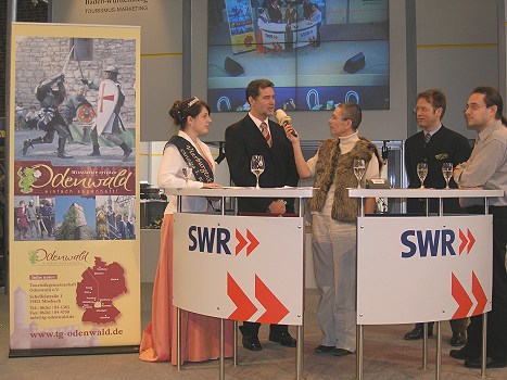 Veranstaltungsjahr der Touristikgemeinschaft Odenwald zum Thema - Mittelalter erleben Das Bild zeigt von links Vierburgenkönigin Christina I., Landrat Detlef Piepenburg, Freiherr Bernolph von Gemmingen-Guttenberg und Burgenforscher Nicolai Knauer.(tw) (nok) Die alten Rittersleut’ erwachen in diesem Jahr im Odenwald zu neuem Leben. Das Jahresthema 2005 der Touristikgemeinschaft Odenwald (TGO) ist ganz einer Epoche gewidmet, die heute noch viele fasziniert – dem Mittelalter. Mit mittelalterlichen Spektakeln, Gauklerfesten und Rittermahlen will man das ganze Jahr über Besucher in die Ferienregion locken und auch den Einheimischen Kurzweil und Abwechslung bieten. Einen ersten Vorgeschmack auf das Jahresthema der TGO gab es bereits auf der CMT in Stuttgart mit der "Nahaufnahme" von SWR4-Kurpfalzradio - einer Live-Sendung aus Halle 4 von der SWR-Bühne.