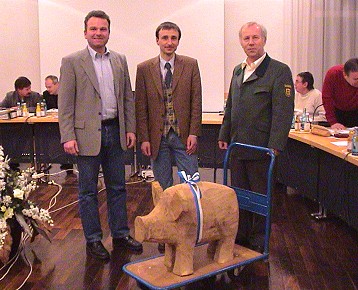 Bürgermeister Bernhard Martin nahm den Wechsel in den Zuständigkeiten zum Anlass, Dr. Georg Bungenstab im Rahmen der heutigen Sitzung des Verwaltungs- und Finanzausschusses eine geschnitzte Wildsau-Skulptur mit auf den Weg nach Neckargemünd zu geben. Dort soll das Werk des Eberbacher Forstwirts und Motorsägen-Künstlers Michael Merkert künftig den Eingangsbereich des Kreisforstamts zieren. Unser Bild zeigt das rustikale Abschiedsgeschenk mit Dr. Georg Bungenstab (rechts), Dr. Dieter Münch (Mitte) und Bernhard Martin.