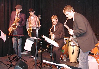 Manuel Dahner, Sebastian Winkler, Benedikt Gareis und Nicolai Pfisterer wurden dabei, wie auf der CD, von Sängerin Nicole Metzger und Schlagzeuger Wolfgang Disch verstärkt. Für die vier jungen Musiker war die Veranstaltung ein erster Hinweis auf die Publikumsakzeptanz des neuen Jazz-Werks. In Anbetracht des begeisternden Applauses dürfte der CD ein reißender Absatz bevorstehen. Moderiert wurde die Veranstaltung vom "Ausbilder" des Quartetts, Ralph Schweizer, der Eingangs noch von einem "blauen Auge" berichtete, das man sich mit dem finanziellen Engagement zur Realisierung der Debüt-CD "Kontraste", geholt hatte. Mit dem jetzt vorgestellten Nachfolgewerk habe man als reine Jazz-CD nun die musikalische Richtung gefunden. Die Besucher waren an diesem Abend zum Spenden aufgerufen. Einen Betrag, der sich zusammen mit den Erlösen aus dem Getränkeverkauf auf 770,08 Euro beläuft, wird das Kulturlabor über UNICEF den Flutopfern in Südasien zur Verfügung stellen.