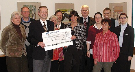 Scheck über 10.000 Euro für Gewerbevereine überreicht Die Volksbankvorstände Ekkehard Saueressig (3.v.l.) und Wilfried Herbold (5.v.r.) mit Marketingassistentin Sabine Heckel (r.) und den anwesenden Vertretern der Gewerbevereine (Foto:Claussen)(jc) Im Rahmen des Förderprogramms für Gewerbevereine im Geschäftsbereich der Volksbank Neckartal überreichten gestern die Bankvorstände Ekkehard Saueressig und Wilfried Herbold einen Scheck über 10.000 Euro. Aufgrund der winterlichen Straßenverhältnisse waren zur Abendveranstaltung nur die Vertreter der Gewerbevereine aus Schönau, Neckargemünd, Meckesheim und Eberbach im Restaurant am Leopoldsplatz erschienen. In der diesmal überschaubaren Runde stellte Ekkehard Saueressig kurz die Eckdaten der Volksbank Neckartal vor, ehe Marketingassistentin Sabine Heckel das Mitgliederprogramm VR-Plus der Volksbank vorstellte. Es beinhaltet für die Mitglieder zahlreiche Vergünstigungen und Sonderleistungen. Für die Teilnahme am lokalen Mehrwertprogramm warb sie bei den anwesenden Gewerbevertretern. Gewerbetreibende profitieren von der Werbung für das Programm. Im Gegenzug müssen Vergünstigungen für VR-Plus-Mitglieder gewährt werden, die sich mit ihrer Mitgliedskarte ausweisen.