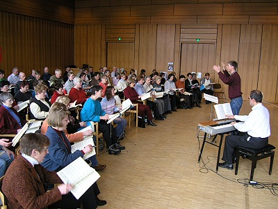 Vorbereitungen für das große Event laufen auf Hochtouren (Foto:Nolten-Casado)(tw) (kke) Die Köpfe rauchten und die Stimmbänder glühten, als die Katholische Kantorei Eberbach und die Bezirkskantorei Bruchsal am Samstag im Pfarrheim einen langen gemeinsamen Probentag verbrachten. Um die 100 Sängerinnen und Sänger ließen sich von Bezirkskantor Godehard Weithoff bei dieser Gelegenheit den letzten musikalischen Schliff verpassen für die Aufführung von Johann Sebastian Bachs Matthäus-Passion am kommenden Sonntag in der katholischen Kirche St. Josef in Eberbach-Nord. Das Konzert beginnt um 17 Uhr, Parkmöglichkeiten stehen den Besuchern an diesem Tag auf den Parkplätzen der Firmen Aldi und Handelshof bzw. Hagebaumarkt zur Verfügung.