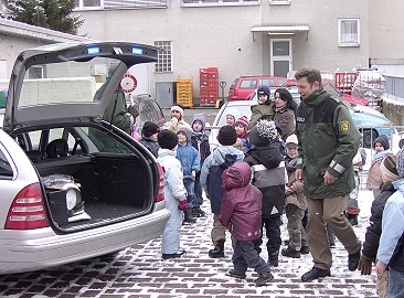 Zusammen mit den Kindern gingen Sie durch die Stadt und übten richtiges Verhalten, auch an der Verkehrsampel. Natürlich durften alle Kinder (auch die jüngeren) das Polizeiauto inspizieren.