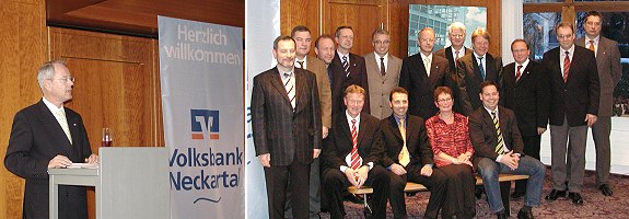 Volksbank Neckartal stiftet Parkbänke im Gesamtwert von 30.000 Euro Vorstandsvorsitzender Herbert Hinterschitt bei seiner Begrüßungsansprache in Neunkirchen, sowie die gesamte Vorstandschaft mit den Bürgermeistern bei der "Bankübergabe". (Fotos:Claussen) (jc) Am Vorabend des 140- jährigen Jubiläums der Volksbank Neckartal versammelten sich am vergangenen Freitag Vorstand und leitende Angestellte mit den Bürgermeistern der Gemeinden aus dem Serviceland genannten Geschäftsgebiet der Bank zu einer kleinen Feier im Hotel Stumpf in Neunkirchen. Am 4. März 1865 wurde in Eberbach der sogenannte "Vorschussverein" gegründet, ein Vorläufer der späteren Volksbank Eberbach. Dieses Datum pflegt die heutige Volksbank Neckartal als offizielles Gründungsdatum.