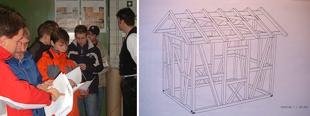 Projekt der Theodor-Frey-Schule und des Hohenstaufengymnasiums Dr. Harald Grote mit Schülern sowie die Zeichnung des Holzbaus. (Foto/Zeichnung:TFS)(jc) (rd) Zur Rettung des Eberbacher Heilkräutergartens in der Au hat Dr. Harald Grote vom HSG ein Gemeinschaftsprojekt zwischen HSG, Theodor-Frey-Schule und BUND Eberbach initiiert.