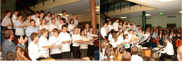 Bewegtes Konzert des Musikzugs im HSG Links: Musikzug 1, rechts: Musikzug 2. (Fotos: Wörner)(ak) Zu einem Wanderkonzert des Musikzugs hatte das Hohenstaufengymnasium gestern Abend eingeladen. Der Musikzug bietet interessierten Schülern zunächst für die Klassen 5 bis 7 verstärkten Musikunterricht an. Was man damit machen kann, wurde im Rahmen dieser Aufführung vorgestellt. Rektor Helmut Schulz begrüßte rund 180 Zuhörer zu dem Konzert unter dem Motto „Musik gibt den Ton an“. Die Darbietungen wurden in der Aula eröffnet vom Unterstufen-Orchester „Wilde 13“ unter der Leitung von Eberhard Höhn, dem Leiter des Musikzugs. Nach 4 Liedern, unter anderem Vivaldis Vier Jahreszeiten, wanderte das Publikum ins erste Stockwerk zu den Schülern des Musikzugs 1 aus den Klassen 5a und 5b. Geleitet von Jutta Gewahl brachten die Zöglinge hier „Vois sur ton chemin“ von Bruno Coulais sowie eine Ton-Sprach-Rhythmusübung zu Gehör, Chor und Orchester außerdem „Pipi Langstrumpf“.