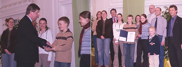 Eberbacher Naturschützer erhielten Preis für ihr Engagement aus den Händen von Minister Stächele Preisverleihung durch Minister Willi Stächele in Stuttgart. (Fotos:privat)(tw) (ka) Im Stuttgarter Neuen Schloss konnte eine kleine Abordnung von Aktiven und Betreuern der Kinder- und Jugendgruppe des Naturschutzbunds Eberbach den "Naturschutzpreis 2004 der Stiftung Naturschutzfonds Baden-Württemberg" aus den Händen des Ministers für Ernährung und Ländlichen Raum, Willi Stächele entgegennehmen. Die Ausschreibung des Preises stand diesmal unter dem Motto: "Kinder - Jugend - Kulturlandschaft".