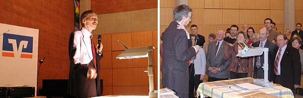 Volksbank lud zu Gedächtnis- und Kreativitätstraining mit Klaus Kolb (Fotos:Claussen)(jc) Auf Einladung der Volksbank Neckartal und der 13 Gewerbevereine im Geschäftsgebiet der Bank, referierte gestern der Betriebswirt und Mentaltrainer Klaus Kolb im Evangelischen Gemeindehaus am Leopoldsplatz. Annähernd 300 Personen waren der Einladung gefolgt und wurden von Vorstandsmitglied Günter Michel im Namen der Volksbank Neckartal begrüßt. Kolb, der als Leiter und Gründer der Gesellschaft für Gedächtnis- und Kreativitätsförderung e.V. in Isny zu den führenden Gedächtnis-Trainern in Deutschland gehört, hielt sich nur wenig mit theoretischen Erläuterungen auf. Nach einer kürzen Demonstration seines eigenen Leistungsvermögens animierte er sofort die Anwesendem zum Gehirnjogging und steigerte mit unspektakulären Tricks innerhalb des 90-Minütigen Seminars bereits die Leistungsfähigkeit der Teilnehmer nachweislich. In der anschließenden Fragerunde wurde deutlich, dass viele Besucher auch mit konkreten Erwartungen ins Gemeindezentrum gekommen waren. "Wie merke ich mir die Binomischen Formeln", "Wie lerne ich Vokabeln" oder "Wie kann ich mir meine nächtlichen Träume besser merken" - die gestellten Fragen verdeutlichten die individuellen Sorgen mit leidigen Gedächtnisschwächen. Zwar konnte der Coach nicht jede Frage abschliessend beantworten, hatte aber Tipps parat. Indes unnormal sind Gedächtnisschwächen nicht, bescheinigte Kolb. "Wer nichts vergisst ist nicht normal", allerdings rät er auch zu täglichem Training um sein Potential besser auszuschöpfen.