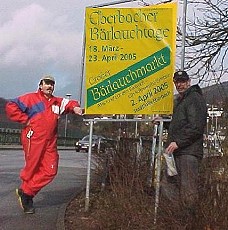 Neue Hinweisschilder an den Ortseingängen (Foto:privat)(cr) Am kommenden Wochenende beginnen wieder die Eberbacher Bärlauchtage (wir berichteten). Die Bärlauch-Aktiven haben jetzt neue großformatige Hinweistafeln angeschafft und an mehreren Durchgangsstraßen aufgestellt, um noch besser auf die Bärlauchtage aufmerksam zu machen. Unser Bild zeigt Jürgen Klier von der "Pleutersbacher Weinstube" (l.) und Rolf Uhrig vom Gasthaus "Kühler Krug" beim Arbeitseinsatz am vergangenen Wochenende.