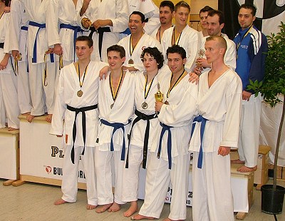 Ausschlaggebend war bei dem um den Eberbacher Murat Cetinkale als Mannschaftsführer bunt zusammengewürfelten Teams aus verschiedenen befreundeten Vereinen vor allem der sehr stark ausgeprägte Teamgeist. Anders war es kaum zu erklären, dass dieses Team ohne echte Leistungsträger nach einem klaren 3 : 0 gegen KZD Konstanz auch den Dritten der DM 2004, Shintaikan Villingen, mit 3 : 1 abfertigte. Der Kampf um den Poolsieg ging dann aber klar an den Deutschen Meister 2004, MTV Ludwigsburg, dessen Aufstellung weitgehend mit dem Nationalteam identisch ist. In der Trostrunde war der Gegner um den entscheidenden 3. Platz das KJC Ravensburg 2, welches vom ehemaligen Bundestrainer Günther Mohr gecoacht wurde. Nach vier Kämpfen stand es 2 : 2, so dass der fünfte Kampf die Entscheidung bringen musste. Hier dominierte Murat Cetinkale in einer emotionsgeladenen Begegnung seinen Gegner deutlich und erkämpfte mit 15 : 11 Punkten den entscheidenden Sieg.