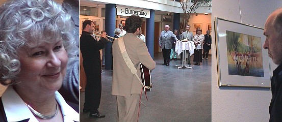 Künstlerische Rück-Bezüge auf die Heimat Inge Maerker (l.) präsentiert Aquarelle im Rathaus. (Fotos:Richter)(hr) Auf drei Etagen im Eberbacher Rathaus sind seit gestern Aquarelle von Inge Maerker zu sehen. "Reflexionen" hat die gebürtige Eberbacherin ihre Ausstellung betitelt und meint damit vor allem künstlerische Rück-Bezüge auf ihre Heimat, denn viele ihrer Motive kennt man aus der eigenen Anschauung: Plätze und Gebäude in Eberbach und Umgebung. Helena Kleinophorst führte bei der gestrigen Vernissage in das Werk der Künstlerin ein, deren Vorliebe der Aquarellmalerei mit ihren verschiedenen Techniken gilt. Themen ihrer Bilder sind auch Blumen-Stilleben und mediterrane Landschaften. Musikalisch bereichert wurde die Ausstellungseröffnung durch Jazz-Klänge des Musikschul-Quartetts Bernhard Sperrfechter, Matthias Debus, Alexander Hartmann und Michael Juszczak.