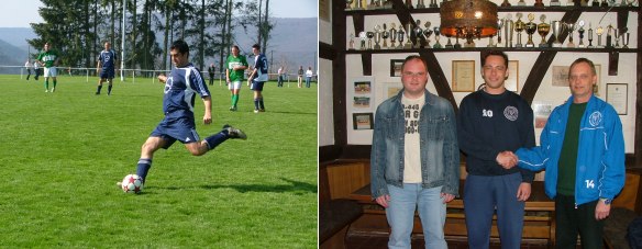 Punkt aus Mückenloch - Trainer verlängerte Vertrag Rockenaus Regisseur Murat Can tritt einen seiner gefährlichen Freistöße. Vereinsvize Torsten Leuwer (li.) und Spielausschussvorsitzender Thomas Achilles (re.) besiegeln die Vertragsverlängerung mit Rockenaus