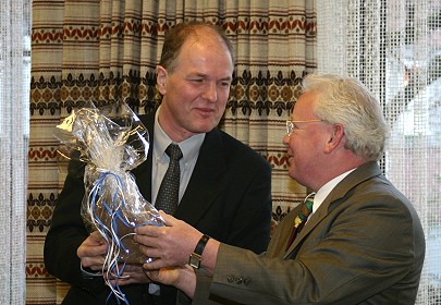 Ortsnahe Versorgung soll gesichert bleiben - neuer Chefarzt der Inneren Abteilung GRN-Direktor Klaus Eiermann (r.) beglückwünscht Dr. Johannes Berentelg zum Dienstantritt. (Foto:Göller)(hr) (Quelle:Eberb.Ztg.) Dr. Johannes Berentelg trat gestern als neuer Chefarzt der Inneren Abteilung seinen Dienst im Kreiskrankenhaus Eberbach an. Im kommenden Jahr soll er auch die Innere Abteilung des Krankenhauses in Sinsheim mit übernehmen. Der Direktor der kreiseigenen Betreibergesellschaft GRN, Klaus Eiermann, begrüßte Dr. Berentelg in seinem neuen Wirkungskreis und wagte einen Ausblick auf die künftige Struktur des Eberbacher Krankenhauses, die derzeit von einer Kommission des Kreises erarbeitet werde. Die Bettenzahl solle von 168 auf 110 sinken, konzentriert auf drei große Einheiten. Bestehen bleiben sollen die Abteilungen Chirurgie, Innere Medizin und Urologie, dazu die operative gynäkologische Abteilung, die Proktologie und die HNO. 2007 soll es auch einen gemeinsamen Chefarzt für die Anästhesie geben.