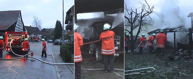 Lagerschuppen brannte (Fotos:Richter)(hr) Erheblicher Sachschaden entstand heute Morgen bei einem Brand in Schönbrunn. Auf dem Anwesen einer Bäckerei in der Hauptstraße war gegen 5.30 Uhr aus noch ungeklärter Ursache in einem Nebengebäude mit Garage und Materiallager ein Feuer ausgebrochen.