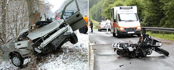 Unfallzahlen rückläufig - Prävention geht weiter Einen tödlichen Unfall gab es am 25. Februar 2004 zu beklagen (l.). Bei den Motorradunfällen war ein leichter Rückgang zu verzeichnen. (Fotos:Archiv)(hr) (pol) Die Polizei registrierte im Jahr 2004 auf den Straßen der Stadt Eberbach 370 (Vorjahr 401), der Gemeinde Schönbrunn 52 (52) und der Gemeinde Heddesbach 3 (7), zusammen 425 (460) Verkehrsunfälle. Dabei entstand ein Gesamtsachschaden von 711.350 (745.850) Euro. 77 (90) Personen wurden bei Verkehrsunfällen verletzt.