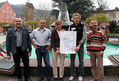 Spitzenläufer im Feld - Plakatierung hat begonnen Die Organisatoren Tobias Soldner (l.), Toni Dausch(2.v.l.) und Frank Knecht (r.) mit Timo Bracht und Angelika Merkel. (Foto:Claussen)(jc) Die Vorbereitung für den 1. CH- alpha Frühlingslauf kommen langsam in die heiße Phase. Am Rande einer Organisationsbesprechung wurden gestern die offiziellen Werbeplakate vorgestellt. Mitorganisator Toni Dausch zeigte sich zufrieden mit dem bisherigen Verlauf der Vorbereitungen. Einige namhafte Läuferinnen und Läufer hätten bereits ihre Teilnahme zugesagt. Bei den Frauen wird die ehemalige Langstrecken- Weltmeisterin und Olympiateilnehmerin Kathrin Dörre- Heinig sowie Andreina Byrd, Spitzenläuferin im deutschen Langstreckenbereich, an den Start gehen. Bei den Männern sollen der finnische Triathlet Jukka Kero und Oliver Stoll vom TV Eberbach für Spitzenzeiten sorgen.