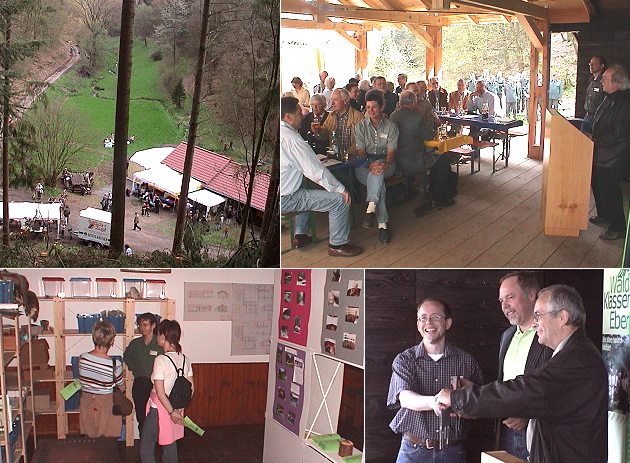 Eberbacher Kinder können jetzt in und mit der Natur lernen Der Betrieb im Waldklassenzimmer hat begonnen. Oben rechts Architekt Harro Kodeda bei seiner Ansprache, unten rechts die Projektübergabe an Dr. Peter Sack (l.) durch Dietrich Müller (Rotary-Club) und Dr. Wilfried Babel (Lions-Club, r.). (Fotos:Richter)(hr) Mitten im Wald, an einer großen Wiese, durch die sich ein Bach schlängelt, liegt das Eberbacher Waldklassenzimmer im Gretengrund. Nach gut zweieinhalbjähriger Vorbereitungs- und Bauzeit wurde es heute mit einer Einweihungsfeier seiner Bestimmung übergeben.
