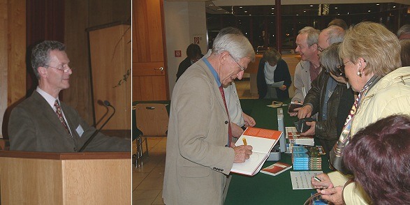Kampf ums Öl oder Frieden durch die Sonne Links Günter Engelhardt, 1. Vorsitzender des Forschungskreises für Geobiologie. Nach seinem Vortrag signierte Dr. Franz Alt im Foyer der Stadthalle seine Bücher. (Fotos:Wörner)(tw) Vereinsmitglieder aus Deutschland, Österreich, der Schweiz, Holland, Belgien, Frankreich und aus Spanien konnte der 1. Vorsitzende des Forschungskreises für Geobiologie Dr. Hartmann e.V., Günter Engelhardt am Freitagabend im gut besetzten großen Saal der Stadthalle begrüßen. Für den Eröffnungsvortrag der diesjährigen Frühjahrstagung hatte man Dr. Franz Alt als Referenten gewinnen können. Der Politik-, Geschichts-, Philosophie- und Theologiewissenschaftler zeichnete für Wissenschaftsmagazine in Funk und Fernsehen verantwortlich und schreibt heute für über 40 Zeitungen und Magazine Gastkommentare und Hintergrundberichte. Die breite Öffentlichkeit kennt ihn aber durch die Sendung "Report" in der ARD, die er von 1972 bis 1992 leitete und moderierte. Mit elf erschienenen Büchern, in denen er sich immer wieder mit dem Thema "Energie" auseinandersetzt, ist Dr. Alt auch ein erfolgreicher Autor. In seinen Büchern stelle er klare Diagnosen, habe aber auch klare Therapien parat, bemerkte Wilhelm Martin aus der Vorstandschaft des Forschungskreises für Geobiologie bei seinen einleitenden Worten zur Person des Vortragenden. "Kampf ums Öl oder Frieden durch die Sonne" ist der Titel eines seiner Bücher und war auch das Thema des Vortrages von Dr. Franz Alt.
