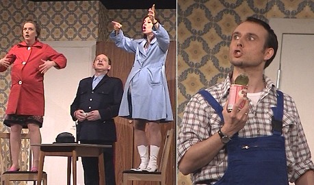 Von Schwangerschaften und Oliven Links: (v.l.) Evelyn Nagel, Hannes Höchsmann und Cornelia Heilmann beschwören die heilige Eulalia, rechts: Karsten Morschett schmeckt die Hundepastete. (Fotos:C.Richter)(ak) Anarchie im Supermarkt! Auf dem Programm der Badischen Landesbühne steht derzeit die Farce des Nobelpreisträgers Dario Fo "Bezahlt wird nicht", die gestern Abend in der Stadthalle gezeigt wurde. Der Einladung des Kulturamts, das Stück in einer Inszenierung von Stefan Holm anzusehen, folgten rund 100 Zuschauer. Das Bühnenbild von Tobias Sieben war ein Wohn-Schlaf-Küchenraum mit Mobiliar und Tapete aus den frühen siebziger Jahren, in dem Luxus nicht vorkommt. Antonia (Evelyn Nagel) erscheint, beide Arme mit vollen Einkaufstüten beladen. Der Inhalt ist Diebesgut und stammt aus einer Revolte gegen die hohen Preise im Supermarkt – den dort einkaufenden Frauen kochte die Wut über, sie nahmen sich wahllos Lebensmittel für Tier und Mensch und bezahlten nicht oder nur so viel, wie sie für richtig hielten. Weil aber Antonias Ehemann Giovanni (Karsten Morschett) äußerst gesetzestreu ist, darf er davon nichts erfahren. Auch nicht von Antonias naiver Freundin Margherita (Cornelia Heilmann), der Antonia etwas abgeben will. Sind beide doch schon seit Monaten die Miete und die Zahlungen für Gas und Strom schuldig geblieben, weil zu wenig Geld da war. Eine Einkaufstüte wird Margherita als Bauch unter den Mantel gebunden und schon ist sie der Tarnung halber schwanger. Im Verlauf der Handlung müssen Antonia und Margherita nun zahlreiche Klippen umschiffen, wobei sich besonders die resolute Antonia als findig erweist. So müssen nicht nur der Polizeiwachtmeister und der Carabiniere (beide Hannes Höchsmann), welche die diebischen Frauen suchen, getäuscht werden, sondern auch Giovanni und später auch Margheritas Ehemann Luigi (Mario Lohmann). Giovanni erfährt dabei, dass außer Herzen auch Embryonen verpflanzt werden, diese in Essig-Salzlake mit Oliven reifen und genießt lieber Hundefutter als Hirsesuppe. Als schließlich Luigi seinem Freund erzählt, dass in seiner Fabrik Kurzarbeit eingeführt wird, packt auch sie beide der Zorn und sie gehen ebenfalls auf Beutezug.