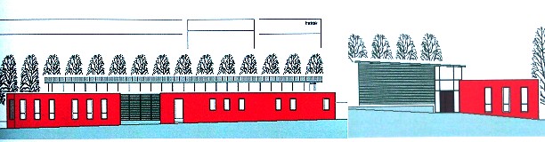 Steilere Dächer auf der Mensa - Beton und Glas dominieren Links die Ansicht aus Richtung Steigestraße, im Hintergrund ist das Grundschulgebäude angedeutet. Rechts die Seitenansicht von Westen. (Repros:Richter)(hr) Der endgültigen Planung für den Mensa-Neubau am Steigeschulzentrum stimmte vorgestern der Eberbacher Gemeinderat zu. Die Pläne waren zuvor bereits mit den Schulen abgestimmt worden. Die Mensa soll nach Abriss des Schulpavillons zwischen Steigestraße und Grundschulgebäude errichtet werden. Sie wird optisch aus drei miteinander verbundenen Gebäudeteilen bestehen: Der große Speiseraum mit 144 Sitzplätzen befindet sich im Hauptbau. Zur Steigestraße hin werden zwei Nebenbauten mit Aufenthalts- und Lernräumen bzw. Essensausgabe, Küche und Sanitäranlagen gebaut. Im Foyerbereich soll ein Schülercafé eingerichtet werden. Als Baumaterialien werden Beton und Glas dominieren, die Außenverkleidung soll teilweise in Holz oder Zementfaserplatten erfolgen. Der Hauptbau soll nach Norden zur Grundschule hin eine komplette Glasfassade bekommen.