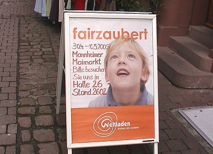 Eberbacher Weltladen auf dem Maimarkt aktiv (Foto:C.Richter)(cr) "Fairzaubert auf dem Maimarkt - die Welt des Fairen Handels" ist das Motto unter dem sich 30 Weltläden aus der Region Rhein-Neckar auf dem Mannheimer Maimarkt präsentieren. Auch acht Mitarbeiterinnen und Mitarbeiter des Eberbacher Weltladens in der Hauptstraße sind zeitweise an dem Stand in Halle 26 im Einsatz. Auf 300 Quadratmeter Fläche werden in Zusammenarbeit mit dem Dachverband Entwicklungspolitik Baden-Würtemberg und dem Mannheimer Eine-Welt-Forum Informationen und Produkte rund um den Fairen Handel angeboten. Aber auch Veranstaltungen wie Faire Modenschau, Konzert mit Klangschalen und Didgeridoo sowie Faire Rosen zum Muttertag sind Programmpunkte, die den Maimarkt "fairzaubern" sollen.